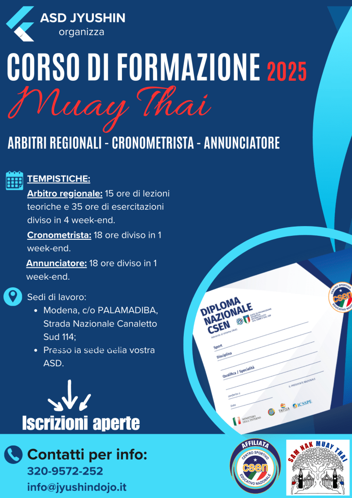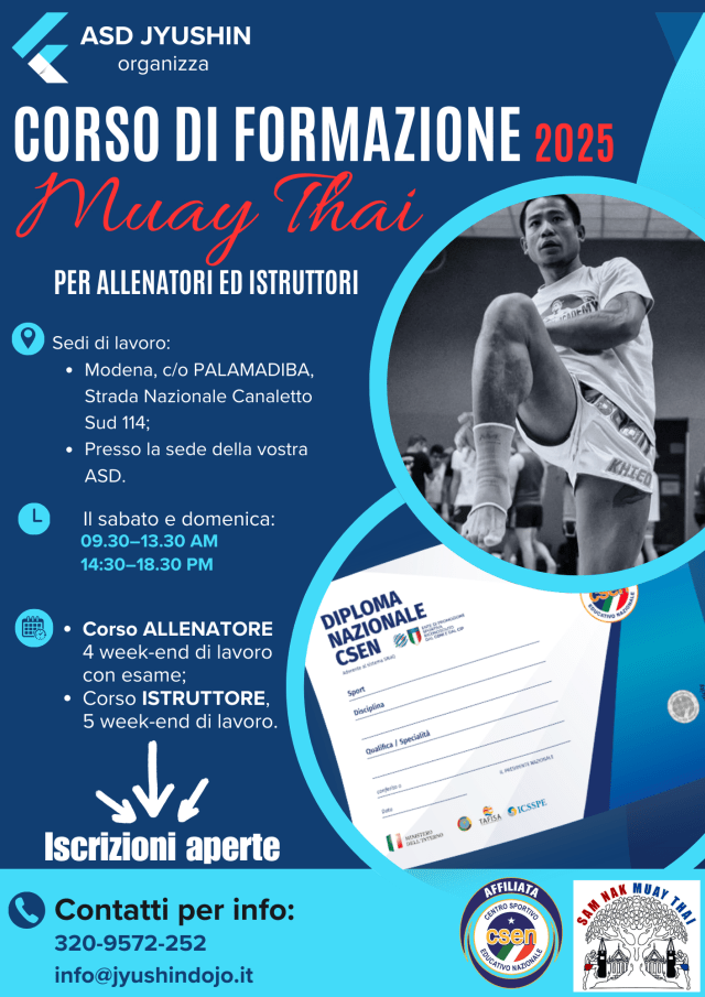 Secondo le normative CSEN in nostro direttore tecnico, il maestro Akkasrivorn (5 titoli mondiali e 1 titolo intercontinentale), seguito da una commissione di esperti, come richiesto da statuto CSEN, formerà in un percorso altamente tecnico per tutti gli atleti che aspirano a diventare responsabili di un corso ed aspirano ed a lavorare con la Muay Thai.