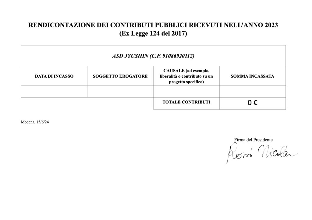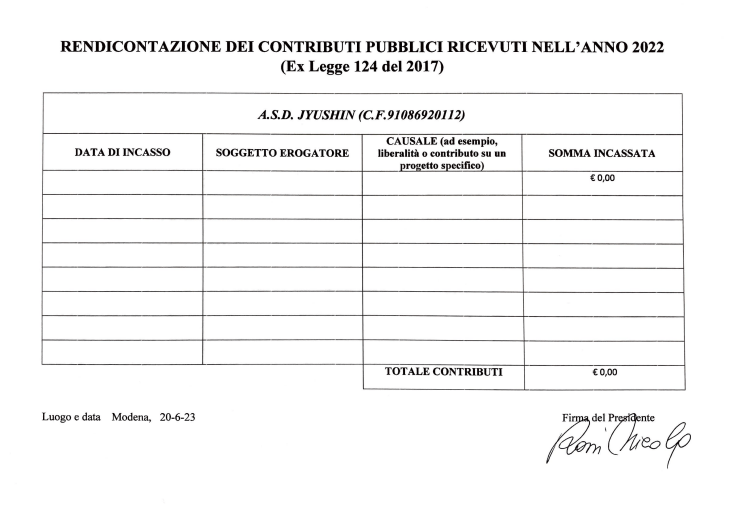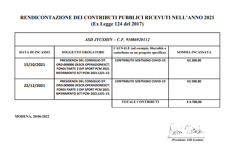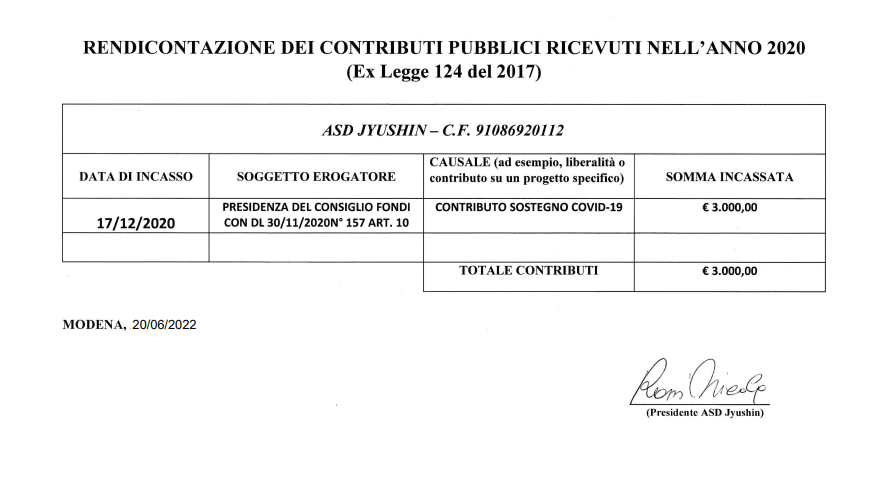 Rendicontazione contributi pubblici anno 2020-21 ricevute dall’ASD Jyushin, responsabile della gestione del Jyushin Dojo in tutte le sue sedi.