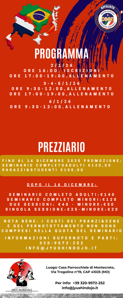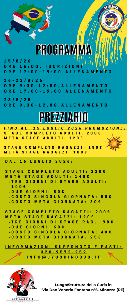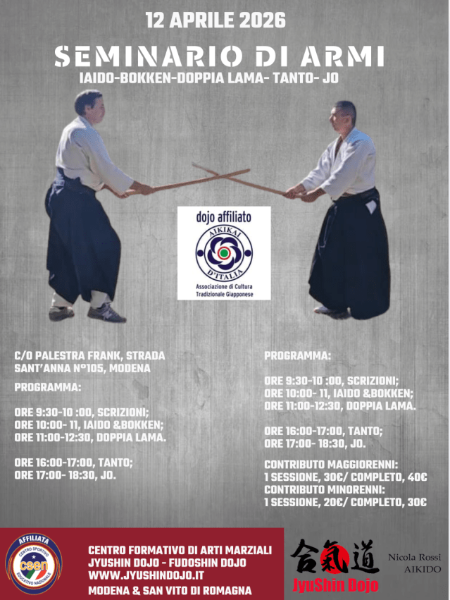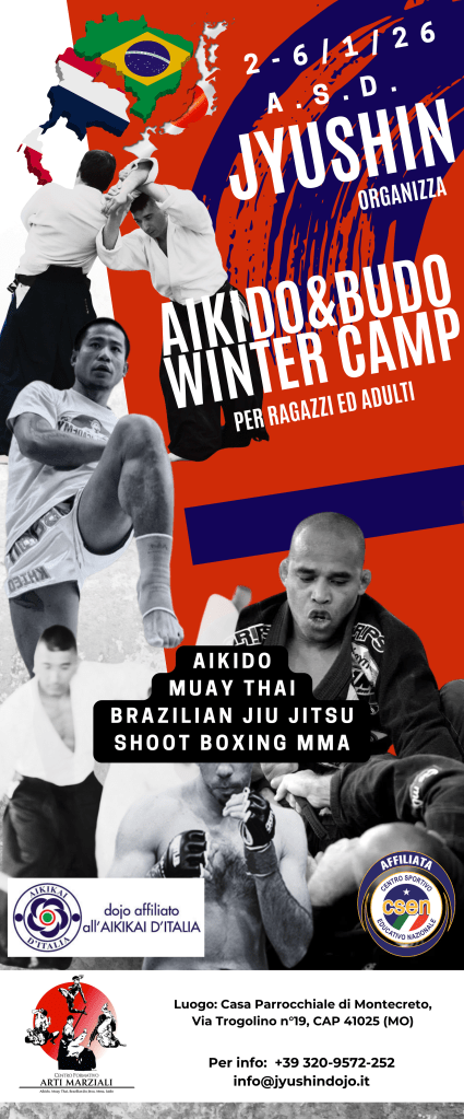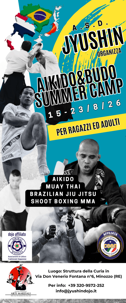 15-23 agosto 2026: “seminario di a”Aikido&Budo Summer Camp” c/o la Struttura della Curia di Minozzo (RE) in Via Don Venerio Fontana n°6. Seminario a cura di Nicola Rossi. Evento diretto dallo staff tecnico del Jyushin Dojo.