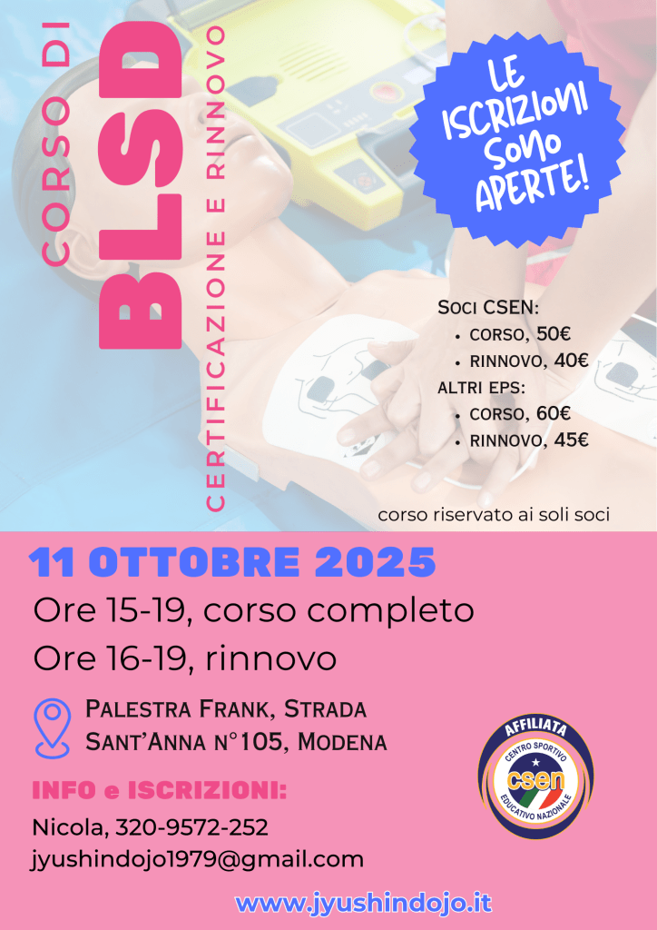 11 ottobre 2025: CORSO DI BASE ED AGGIORNAMENTO “BLSD” aperto a tutti c/o Palestra Frank di Modena sita in Strada Sant’Anna 105.