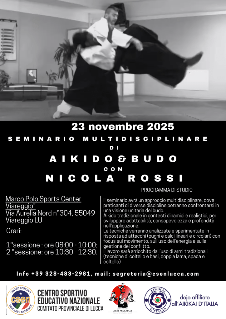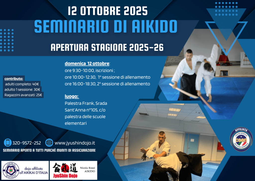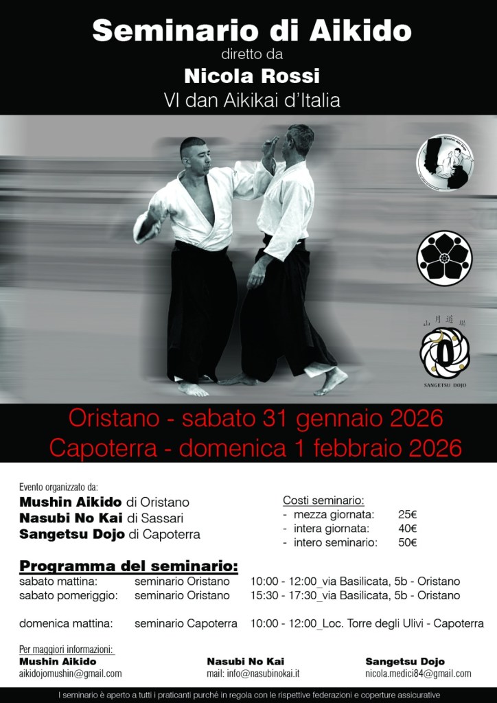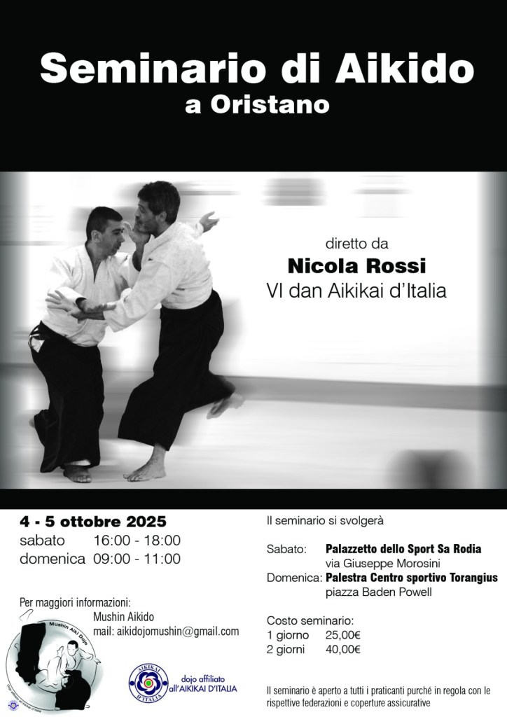 4-5 ottobre 2025: seminario di aikido organizzato dal Mushin Aikido di Oristano, Sardegna. Per info sul luogo consultare la locandina. Seminario a cura di Nicola Rossi.