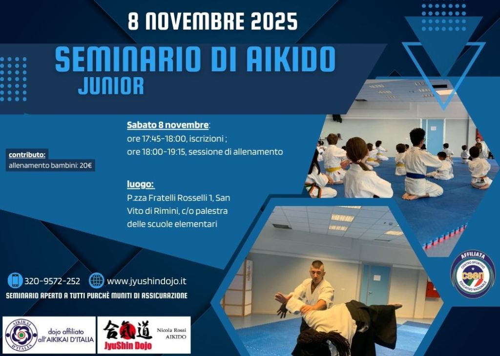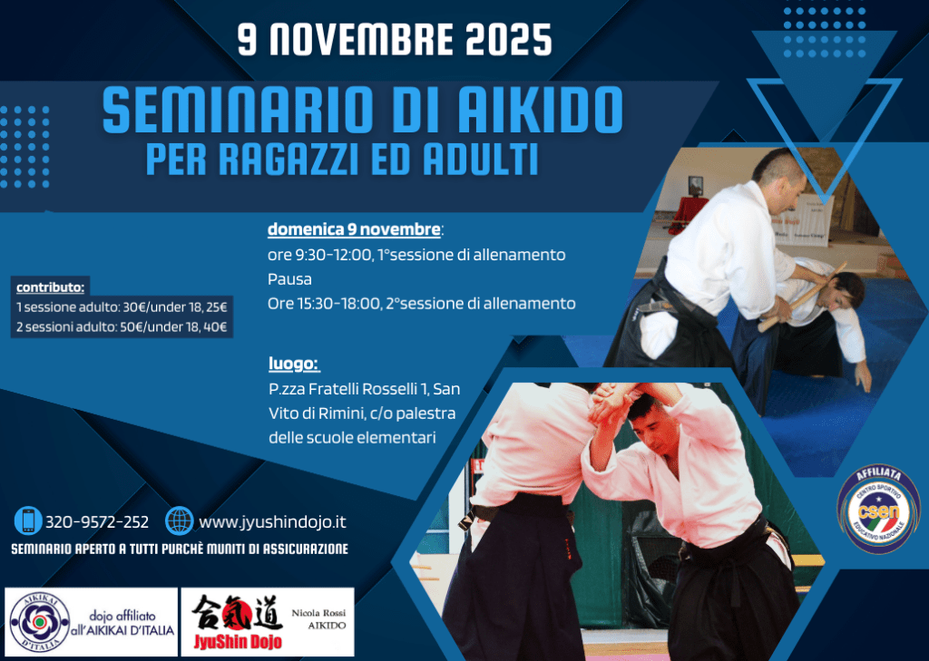 9 novembre 2025: seminario di aikido per ragazzi e adulti c/o Fudoshin Dojo di San Vito (RN) sita in Piazza Fratelli Rosselli 1. Seminario a cura di Nicola Rossi.