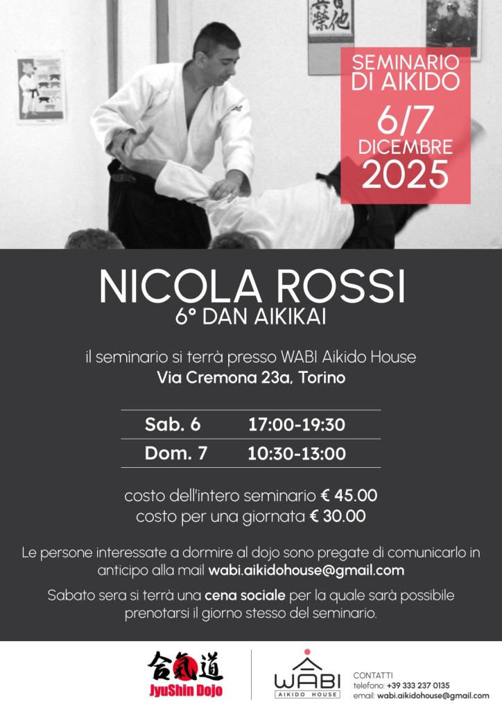 6-7 dicembre 2025: seminario di aikido c/o WABI Aikido House di Torino sita in Via Cremona 23a. Seminario a cura di Nicola Rossi.