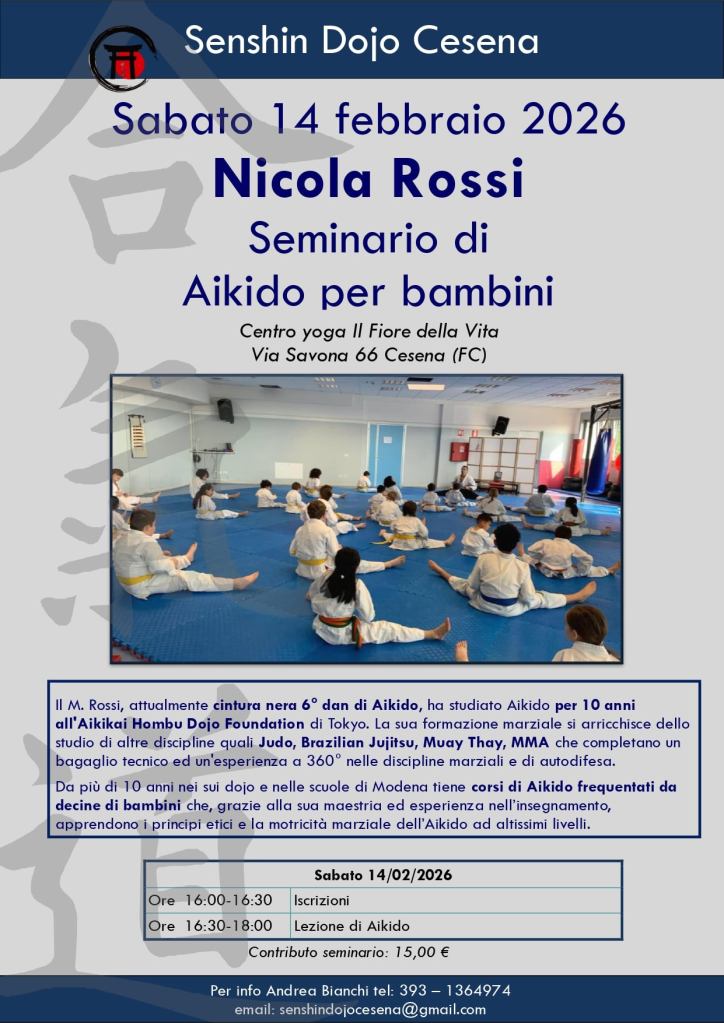 14 febbraio 2026: seminario bambini di Aikido&Self Defence c/o il Centro Il Fiore della Vita, in Via Savona 66, Cesena (FC). Seminario a cura di Nicola Rossi.