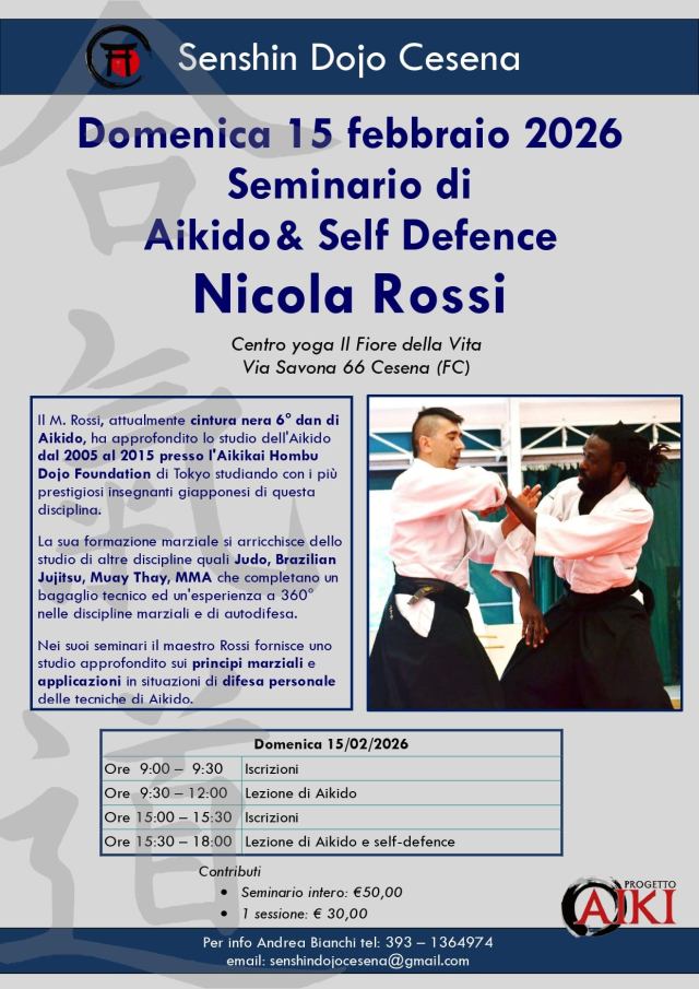 15 febbraio 2026: seminario di Aikido&Self Defence c/o il Centro Il Fiore della Vita, in Via Savona 66, Cesena (FC). Seminario a cura di Nicola Rossi.