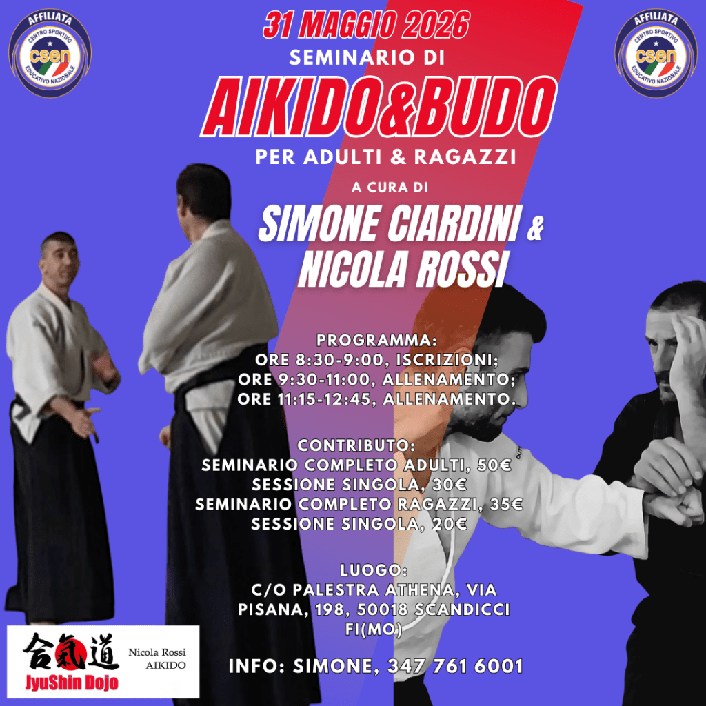 31 maggio 2026: seminario di aikido e Bodo c/o PalestraAthena di Scandicci sita in Via Pisana 198. Seminario a cura di Simone Ciardini e Nicola Rossi.