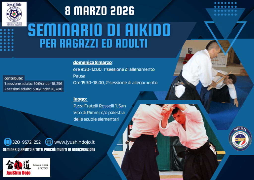 8 marzo 2026: seminario di Aikido per ragazzi ed adulti c/o Fudoshin Dojo di San Vito (RN) sita in Piazza Fratelli Rosselli 1. Seminario a cura di Nicola Rossi.