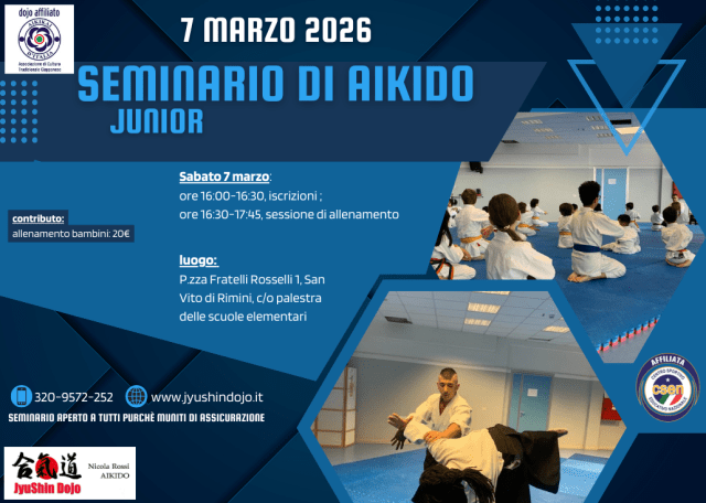 7 marzo 2026: seminario di Aikido per bambini c/o Fudoshin Dojo di San Vito (RN) sita in Piazza Fratelli Rosselli 1. Seminario a cura di Nicola Rossi.