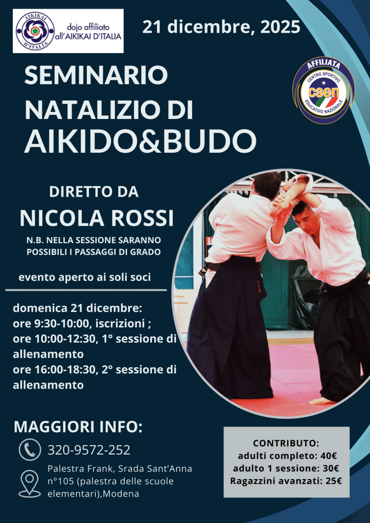 21 dicembre 2025: seminario di natalizio di aikido c/oc/o Palestra Frank di Modena sita in Strada Sant’Anna 105. Seminario a cura di Nicola Rossi.
