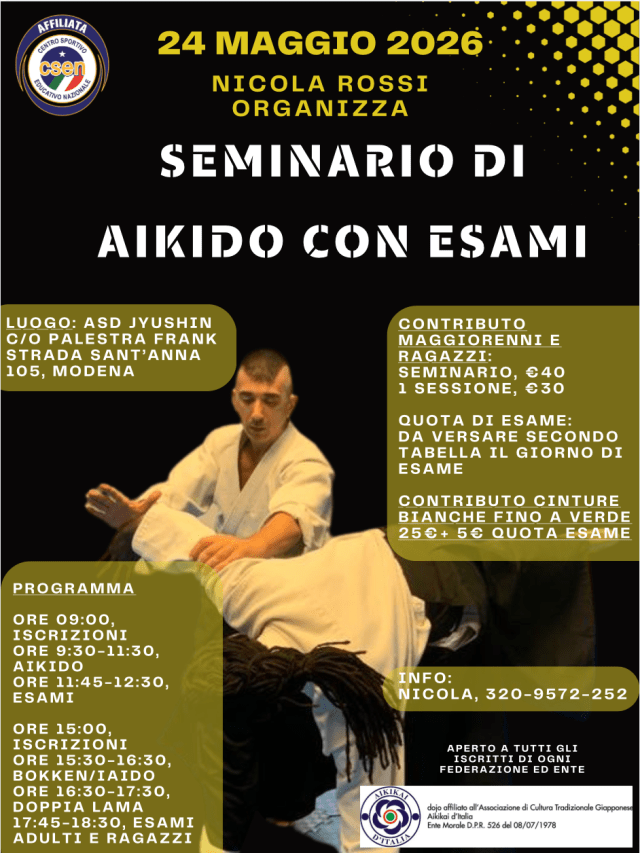 24 maggio 2026: seminario di aikido con passaggi di grado per bambini, ragazzi ed adulti c/o Palestra Frank di Modena sita in Strada Sant’Anna 105. Seminario a cura di Nicola Rossi.
