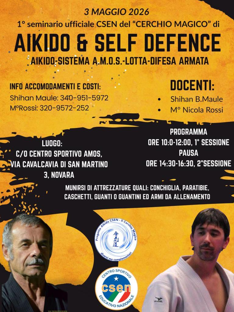 3 maggio 2026: seminario di aikido&self defence per bambini, ragazzi ed adulti c/o Centro Sportivo Amos di Novara sito in Via Cavalcavia di San Martino n°3. Seminario a cura di Shihan Bruno Maule e Nicola Rossi.